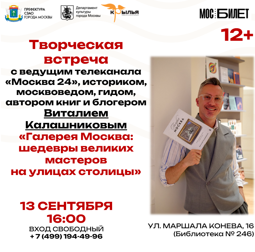 Откроет программу встреча-приветствие, в ходе которой будут представлены тематические книжные выставки, превью экспозиции декоративно-прикладного творчества «С любовью из прошлого», проведен флешмоб «География праздника» с интерактивной картой Москвы. Знаковым мероприятием станет творческая встреча с телеведущим канала «Москва 24», историком, москвоведом, автором книг, гидом и блогером Виталием Калашниковым. Совсем недавно (летом) в издании БОМБОРА вышла в свет его книга «Галерея Москва: шедевры великих мастеров на улицах столицы» про искусство на улицах Москвы (памятники, мозаики, витражи, фонтаны, барельефы и многое другое). В ходе встречи осуществится презентация данной книги, гости услышат рассказ Виталия о знаковых локациях и точках Москвы, которые без преувеличения можно причислить к произведениям искусства мирового уровня. Также старина Калашников ответит на вопросы гостей мероприятия, после чего будет разыграна презентуемая книга за самый интересный вопрос. В завершение встречи гостей познакомят с тематической книжно-иллюстративной выставкой «Лучший город земли», в экспозиции которой, также будет представлена первая литературная работа В. Калашникова «Артефакты Москвы. Исторические детали столицы, которые вы не замечали» из фонда библиотеки. А в финале программы состоится интеллектуальная игра с использованием нейросетей «С ИИ по столице».